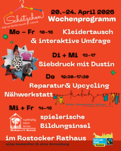 Melde dich gerne unter hallo@fairtradestadt-rostock.de für den Schätzchen-Newsletter an. Dann erhältst du als erstes die genauen Termine und weitere Informationen rund um die Fairtrade-Stadt Rostock.